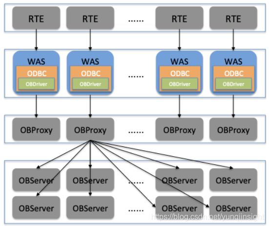 在 TPC-C 标准定义中,测试系统分为 RTE(Remote Terminal Emulator)和 SUT 两部分。在实际的 TPC-C 测试流程中,不只是对 DB 端能力的考验,对链路中的所有组件都存在极大的资源消耗和压力。以这次 6088万 tpmC 测试结果看,我们一共在 64 台 64C128G 的云服务器上运行了 960 个 RTE 客户端,来模拟总计 47942400 个用户 Terminal,最后还需要基于这么多 RTE 统计结果进行一致性和持久化审计验证。而 SUT 又拆分为三部分:WAS(Web Application Server) 、OceanBase Proxy(OBProxy) 和 OceanBaseServer(OBServer)。RTE 的请求到 WAS,然后 WAS 通过 OceanBase 客户端来访问 OBProxy,OBProxy 会将请求转发到后端 OceanBase 集群中最佳的 ObServer 去执行请求。WAS 和 OBProxy 是 RTE 和 OBServer 之间的桥梁,这个桥梁对于承载压力起着至关重要的作用。本次TPC-C 基准测试中,OceanBase 访问链路上主要涉及两个组件: