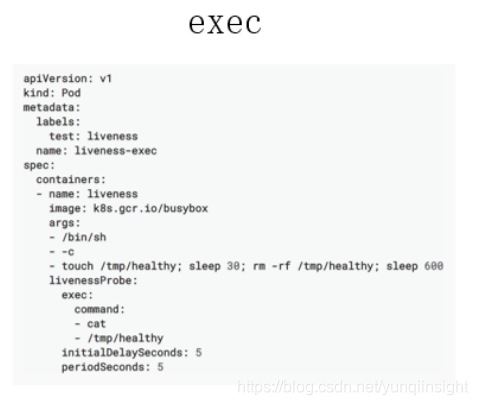 首先先看一下 exec,exec 的使用其实非常简单。如下图所示,大家可以看到这是一个 Liveness probe,它里面配置了一个 exec 的一个诊断。接下来,它又配置了一个 command 的字段,这个 command 字段里面通过 cat 一个具体的文件来判断当前 Liveness probe 的状态,当这个文件里面返回的结果是 0 时,或者说这个命令返回是 0 时,它会认为此时这个 pod 是处在健康的一个状态。