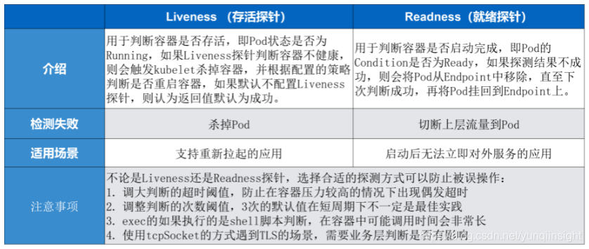 在使用 Liveness 指针和 Readiness 指针的时候有一些注意事项。因为不论是 Liveness 指针还是 Readiness 指针都需要配置合适的探测方式,以免被误操作。