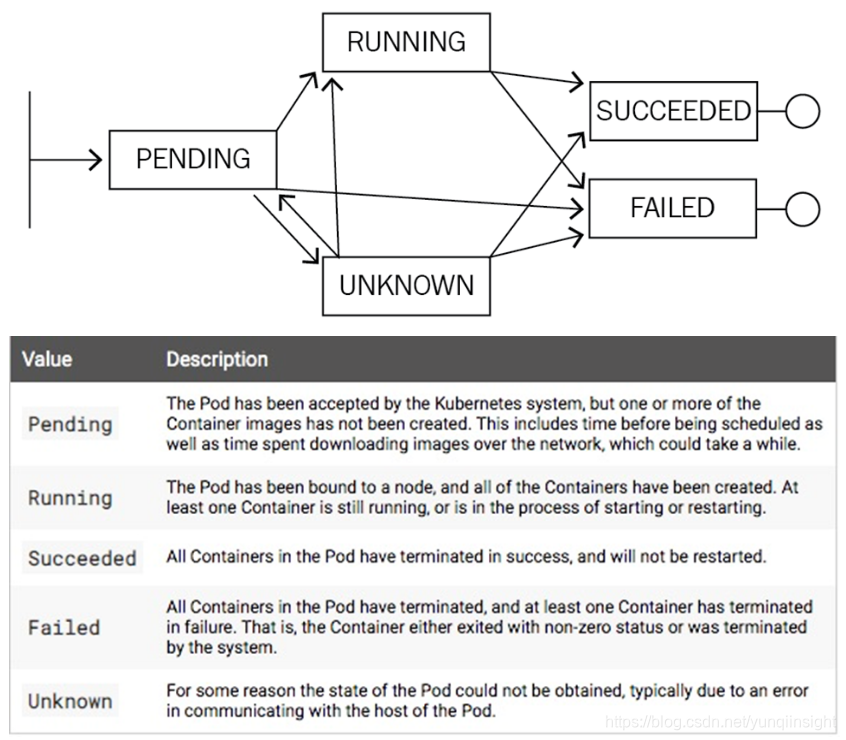比如说上面的图,实际上是一个 Pod 的一个生命周期。刚开始它处在一个 pending 的状态,那接下来可能会转换到类似像 running,也可能转换到 Unknown,甚至可以转换到 failed。然后,当 running 执行了一段时间之后,它可以转换到类似像 successded 或者是 failed,然后当出现在 unknown 这个状态时,可能由于一些状态的恢复,它会重新恢复到 running 或者 successded 或者是 failed 。