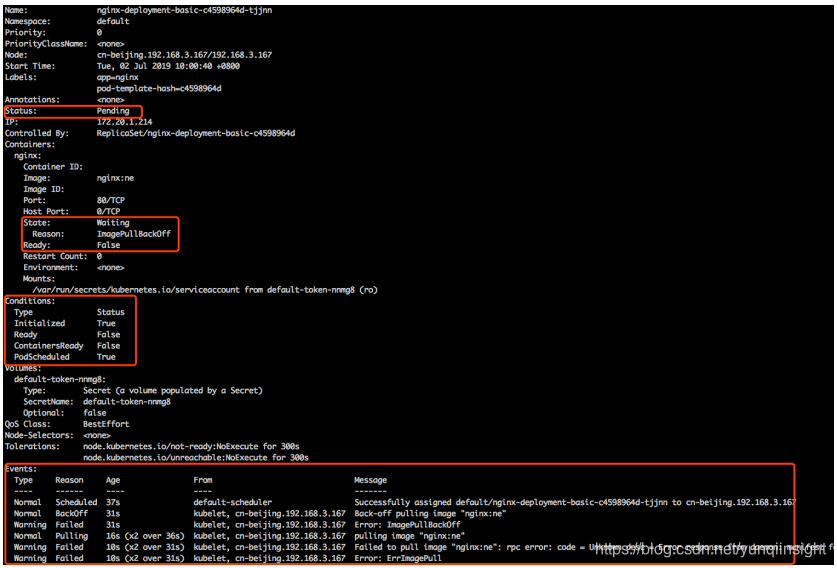 那第二个状态就是 pod 可能会停留在 waiting 的状态,pod 的 states 处在 waiting 的时候,通常表示说这个 pod 的镜像没有正常拉取,原因可能是由于这个镜像是私有镜像,但是没有配置 Pod secret;那第二种是说可能由于这个镜像地址是不存在的,造成这个镜像拉取不下来;还有一个是说这个镜像可能是一个公网的镜像,造成镜像的拉取失败。