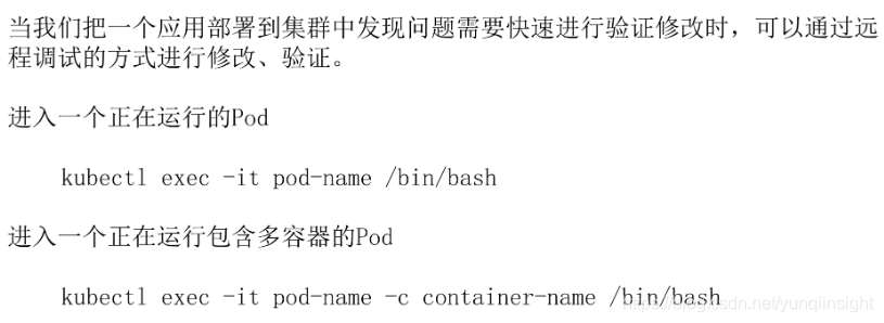 比如说可以通过 exec 的方式进入一个 pod。像这条命令里面,通过 kubectl exec-it pod-name 后面再填写一个相应的命令,比如说 /bin/bash,表示希望到这个 pod 里面进入一个交互式的一个 bash。然后在 bash 里面可以做一些相应的命令,比如说修改一些配置,通过 supervisor 去重新拉起这个应用,都是可以的。