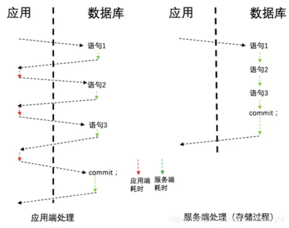在C/S(client-server)模型中,一条SQL语句从发起到执行完成需要经历从客户端输入、网络传输、SQL优化、执行、结果返回到客户端这样一个流程。而具体每一条SQL的执行可能只是做一个字段的更新,所需要的执行时间是非常短暂的,从整个链路的角度来看,大量的时间会花费在与客户端的交互过程中,造成资源的浪费和耗时的增加。那么如何解决这个问题的呢?答案就是使用存储过程。