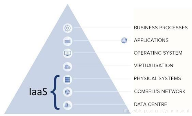 IaaS(Infrastructure as a Service) 基础设施即服务,服务商提供底层/物理层基础设施资源(服务器,数据中心,环境控制,电源,服务器机房),用户需要通过 IaaS 提供的服务平台购买虚拟资源,选择操作系统、安装软件、部署程序、监控应用。