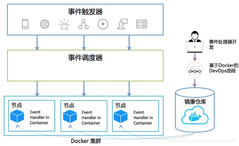 - 事件调度系统配合 Docker 集群运行 Docker 容器来执行 Function