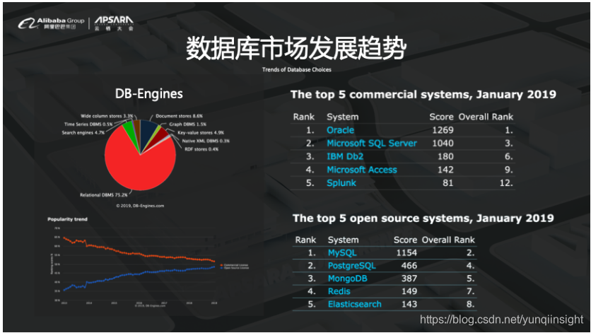 开源数据库的出现影响了整个数据库市场的格局和版图,也为阿里巴巴在数据库市场提供了一个重大的机会。经过十年的时间,阿里云数据库做到了“全国第一,全球领先”。当然,影响数据库格局的重要因素除了开源之外,还有云计算的兴起。