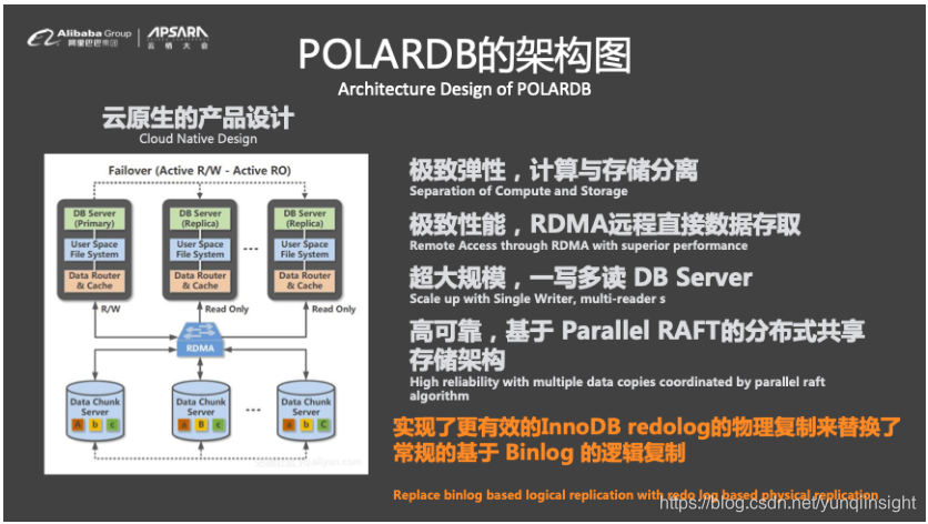 因此,阿里云提供了POLARDB数据库。POLARDB基于业界先进的Shared-Everything架构,简单而言,就是借助高速的RDMA网络将所有数据库节点连接在同一网络下。POLARDB采用计算与存储分离的架构,数据节点是无状态的,因此一旦发生宕机可以随时进行迁移。