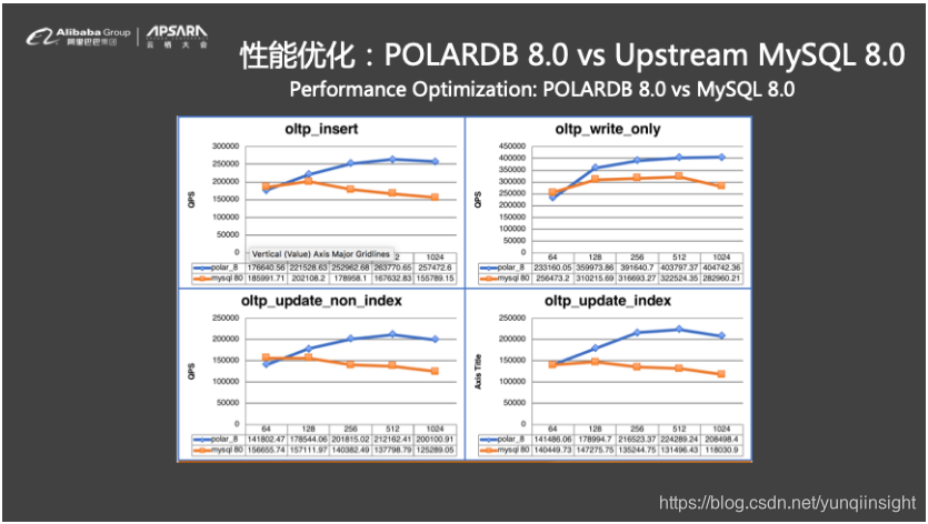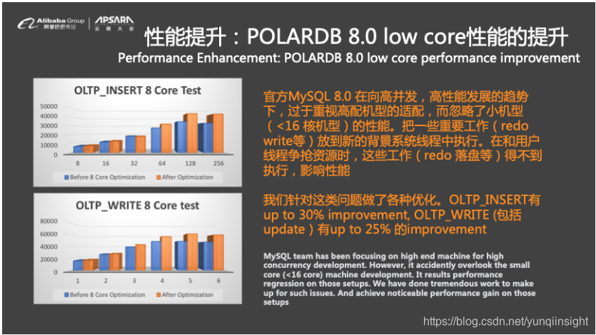 官方MySQL向8.0版本演进时过于重视高配机型的适配,而忽略了小型机的性能。而云上用户大部分还是用的8核、16核的小型机,因此使用MySQL8.0的性能会发生退化。因此,阿里云POLARDB数据库针对于这个问题进行了一系列优化。