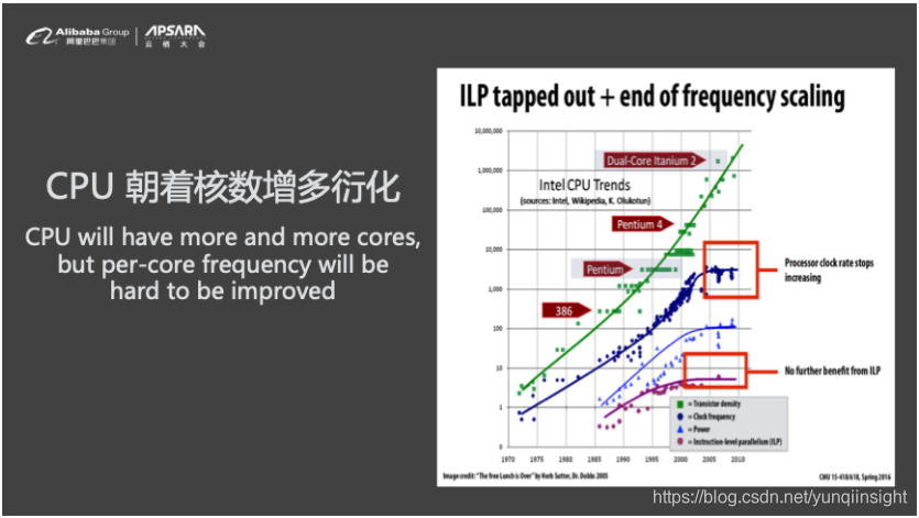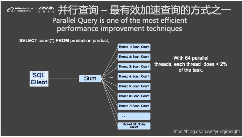 此外,业界的一个趋势CPU单核频率达到了瓶颈,增长放缓。而我们对于计算能力的诉求是永无止境的,因此CPU只能向着多核演进。而MySQL属于传统事务型数据库,其无法并行执行单条Query,因此无法充分利用多核的作用。业界的通用做法就是并行查询,如今几乎所有商业数据库都提供并行查询的能力,将任务分摊给多个线程并行计算,大幅度缩短计算时间。
