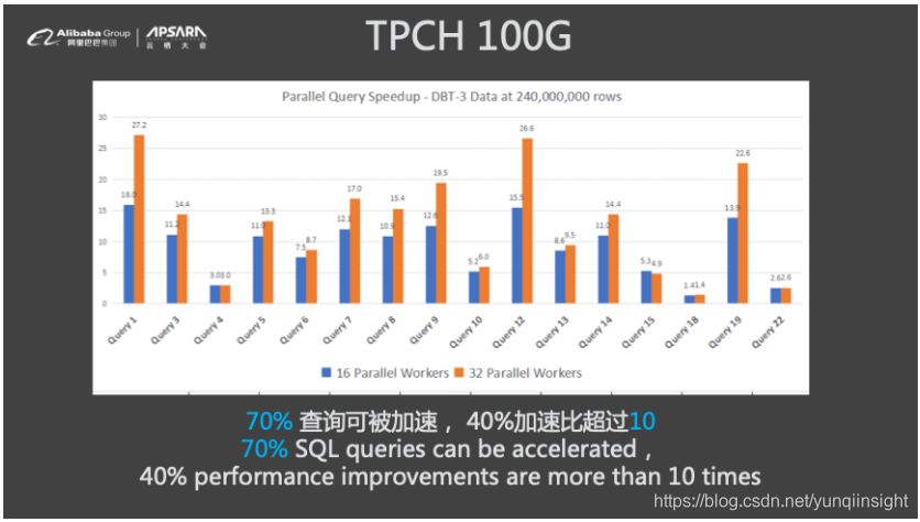 那么,并行查询的效果如何呢?在TPCH 100G数据量的情况下,使用POLARDB并行查询时发现70%的查询可以被加速,40%的加速比超过10倍,几乎能够将CPU能力完全发挥出来。
