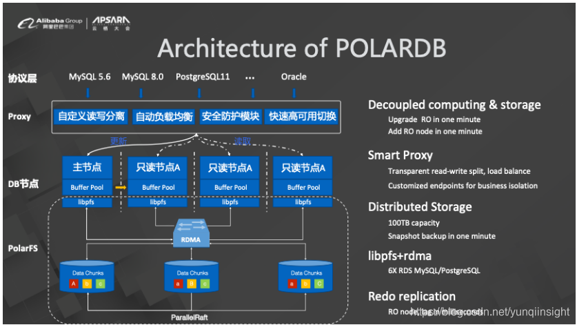 在可靠性方面,POLARDB基于Parallel Raft协议并借助RDMA能够做到RPO=0。此外,POLARDB基于TCP的远程物理复制技术实现了跨AZ的容灾。