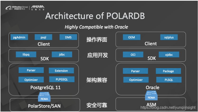 POLARDB Oracle版本从几个层次做了兼容,首先是操作界面能够完全兼容,对于DBA而言迁移成本基本为0。其次,对于应用开发而言,目前POLARDB使用的PG开源的SDK。而对于引擎架构而言,POLARDB的架构基本和Oracle类似。目前使用的存储也是和ASM对标的。