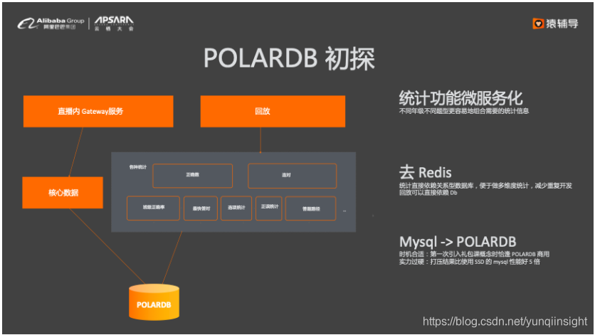 猿辅导最初使用MySQL + Redis方案,MySQL落盘核心数据并提供回放服务,Redis则实现各种榜单供直播使用。这种方案的问题是Redis数据无法复用,导致写多份,并且单机MySQL存在性能瓶颈无法支持更高的QPS。后来猿辅导就引入了POLARDB数据库,并将统计功能进行了微服务化,去掉了Redis。