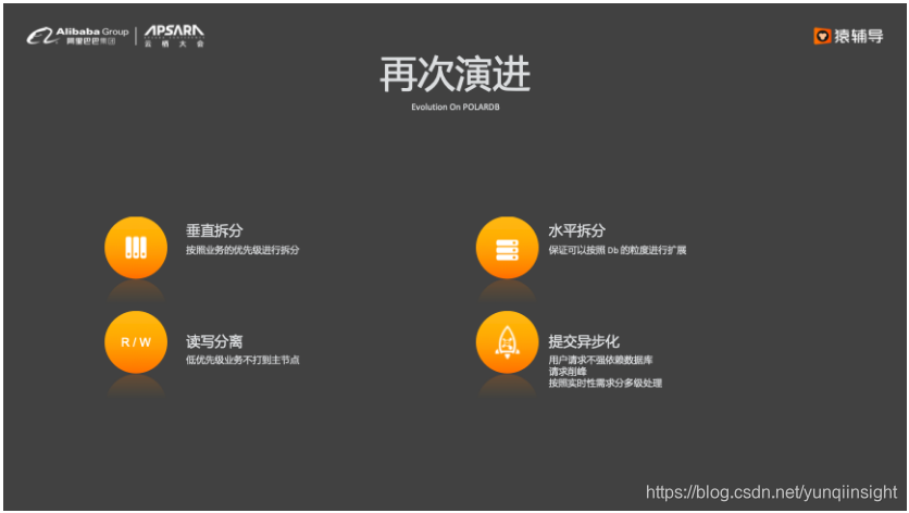 这样的方案运行了半年,也遇到了三点主要的问题:处理能力被高估、缺乏隔离和缺乏扩展性。于是猿辅导借助POLARDB实现的数据库架构的再次演进,实现了数据库的垂直拆分、水平拆分、读写分离和提交异步化。