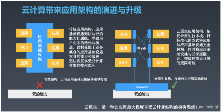 云原生的本质,是一种让应用最大程度享受云计算红利的架构思想。这种思想,实际上是在云计算技术不断普及的过程中,应用基础架构不断朝着”让专业的人做专业事“的方向持续演进、然后逐步沉淀下来的一套最佳实践和架构范式。