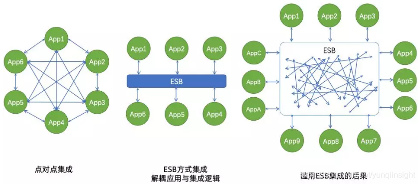 - ESB 基于一个中心化的消息处理系统,但随着互联网的高速发展,ESB 已经无法应对企业IT规模化成长的挑战;