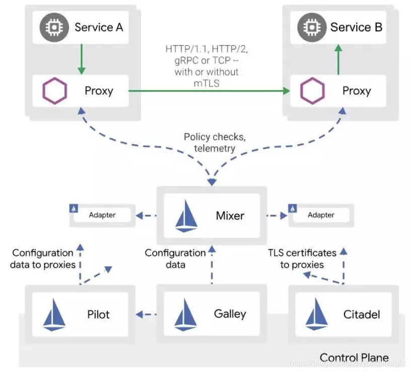- 控制平面中,Galley 负责配置管理,Pilot 负责下发配置,Mixer 负责策略检查和遥测数据聚合,Citadel 负责通信中安全证书管理。