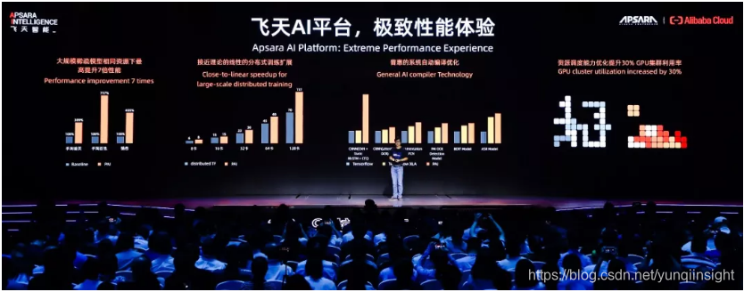 在AI平台层,飞天AI平台、飞天大数据平台、AIoT平台等大大降低AI开发门槛。其中,飞天AI平台是国内首个云端商业化机器学习平台,支持上百亿特征、千亿训练样本的超大规模经典算法,降低35%训练成本、多个场景下提升400%训练速度,还首创公共云上可视化建模,为开发者提供了接近本地开发的极致体验。