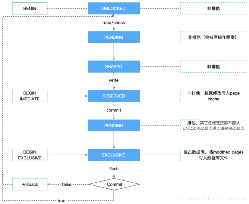 sqlite对每个连接设计了五钟锁的状态(UNLOCKED, PENDING, SHARED, RESERVED, EXCLUSIVE), sqlite的事务模型中通过锁的状态保证读写事务(包括显式的事务和隐式的事务)的一致性和读写安全。sqlite官方提供的事务生命周期如下图所示,我在这里稍微加了一些个人的理解: