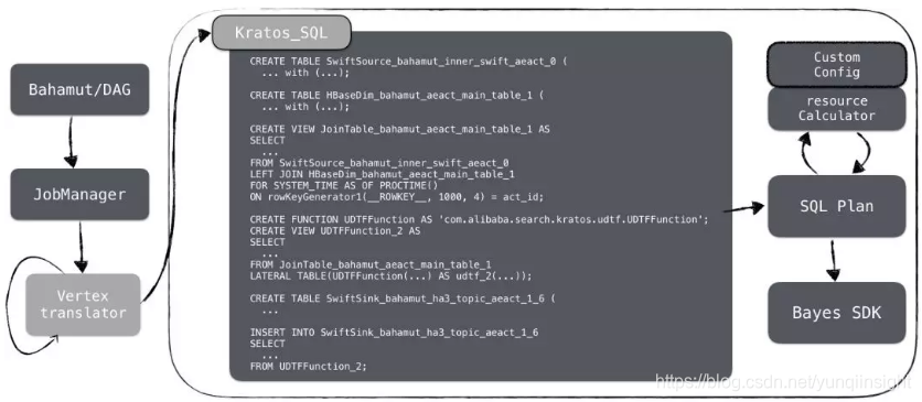 其中,Bahamut将任务拆解后扔给JobManager进行逻辑节点到物理节点的转换,形成若干节点后再归并组合成一个完整的SQL语句,例如上图Kratos_SQL就是一个增量Join的完整SQL,配合资源文件一起通过BayesSDK提交任务。此外,平台增加了一个弱个性化配置的功能,可以通过个性化配置来实现控制某个具体任务的并发度、节点内存、cpu等等参数。