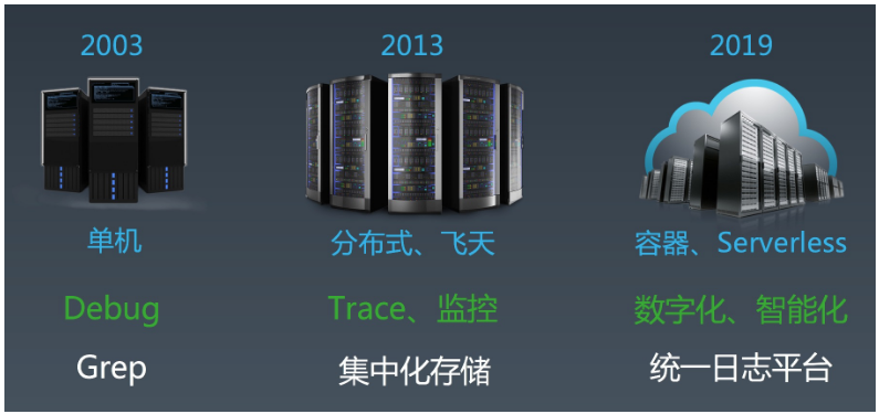 在阿里的十多年中,日志系统伴随着计算形态的发展在不断演进,大致分为 3 个主要阶段: