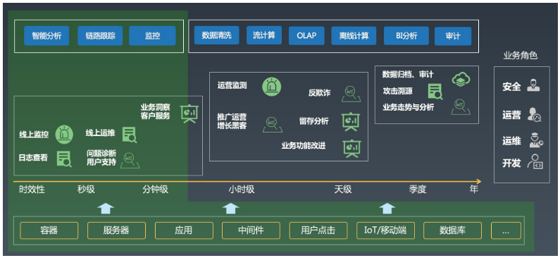 在阿里,几乎所有的业务角色都会涉及到各式各样的日志数据,为了支撑各类应用场景,我们开发了非常多的工具和功能:日志实时分析、链路追踪、监控、数据加工、流计算、离线计算、BI 系统、审计系统等等。日志系统主要专注于数据的实时采集、清洗、智能分析与监控以及对接各类各样的流计算、离线系统。