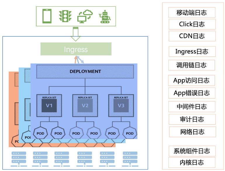 - 日志的种类变多,上图是一个典型的 Kubernetes 架构,一个请求从客户端需要经过 CDN、Ingress、Service Mesh、Pod 等多个组件,涉及多种基础设施,其中的日志种类增加了很多,例如 K8s 各种系统组件日志、审计日志、ServiceMesh 日志、Ingress 等;