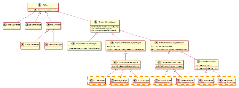 第二个版本,我们选择自定义Widget、Element以及RenderObject;下面是我们一部分组件的类图。