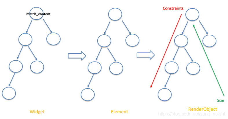 在Flutter中,并没有match_parent和match_content的概念。最初我们的想法很简单,在Widget的build方法中,如果属性是match_parent,就不断向上遍历,直到找到一个父节点有确定的宽高值为止;如果是match_content,遍历所有的子节点,获取子节点大小;一旦子节点存在match_content属性,会递归调用下去。
