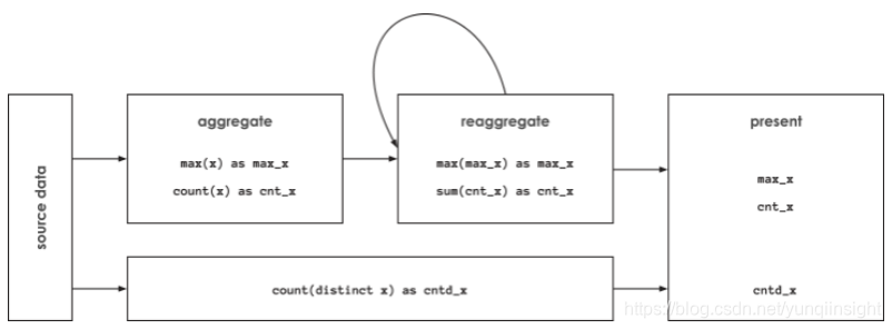 预聚合是数据分析领域的一个强大的技术手段,前提就是所要计算的指标是可重聚合的。聚合操作,顾名思义,是满足结合律的,所以很容易引入再聚合操作,因为聚合操作可以再被进一步聚合。Counts 可以在通过 SUM 再聚合,最小值可以通过 MIN 再聚合,最大值也可以通过 MAX 再聚合。而 distinct counts 是特例,无法做再聚合,例如,不同网站访问者的 distinct count 的总和并不等于所有网站访问者的 distinct count 值,原因很简单,同一个用户可能访问了不同的网站,直接求和就存在了重复统计的问题。