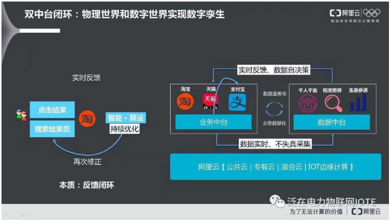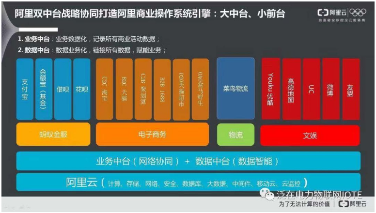 这张图诠释了阿里的商业操作系统的引擎:大中台,小前台,展示的很清晰了,特别提醒要理解两个重要概念:业务数据化和数据业务化。