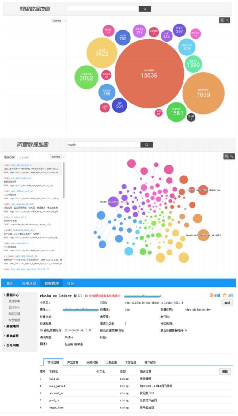 资产地图:本质上是数据字典的图形化版本,阿里有多少数据、如何存储、数据之间关系如何、如何找、如何用都可以从资产地图找到答案,蛮形象的,从网上资料看,其设计还是值得借鉴,以下是一些界面截图。