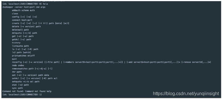使用zkCli.sh连接到服务端后,可以使用help展示常见命令的使用方式。