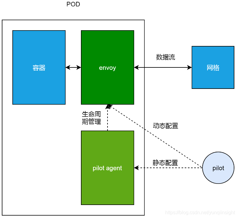 如下图,envoy是实际上负责流量管理等功能的代理,从业务容器出、入的数据流,都必须要经过envoy;而pilot-agent负责维护envoy的静态配置,以及管理envoy的生命周期。这里的动态配置部分,我们在下一节会展开来讲。