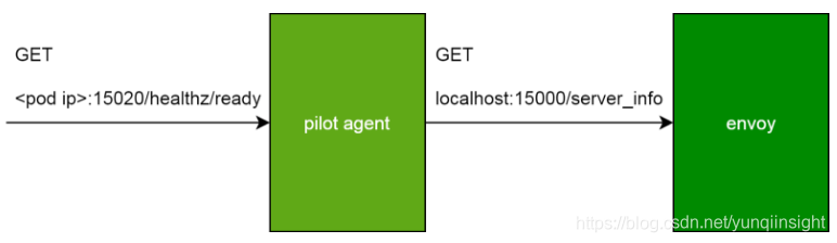 实际上pilot-agent就绪检查接口的实现正是如此。这个接口在收到请求之后,会去调用代理envoy的server_info接口。调用所使用的的IP是localhost。这个非常好理解,因为这是同一个pod内部进程通信。使用的端口是envoy的proxyAdminPort,即15000。