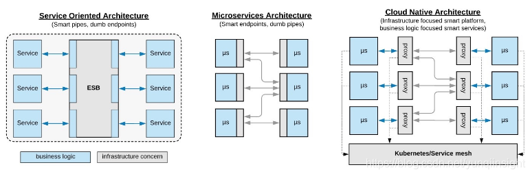 | 服务治理 | ESB | 微服务/API网关 | 服务网格 |