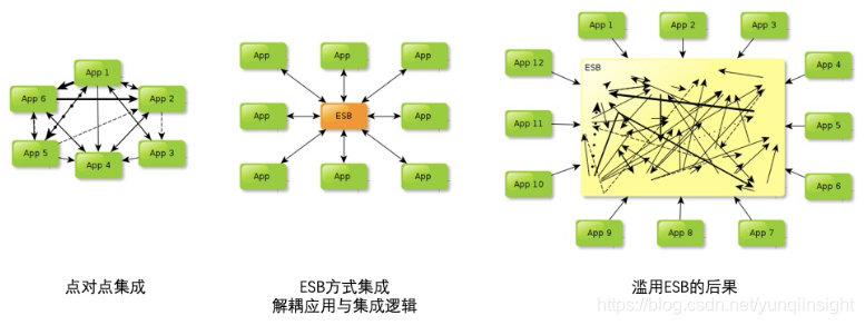 - ESB基于一个中心化的消息处理系统,但随着互联网的高速发展,ESB已经无法应对企业IT规模化成长的挑战。