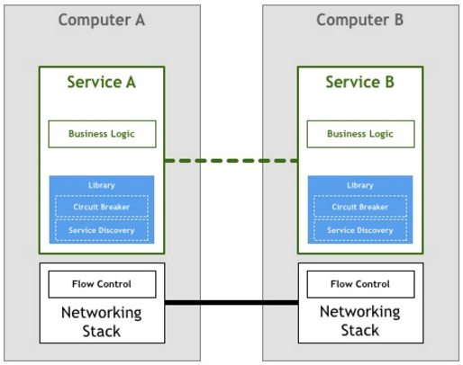 微服务架构首先要面对分布式架构的内生复杂性,请参考 分布式计算的误区。微服务框架需要能够解决服务通信和服务治理的复杂性,比如服务发现、熔断、限流、全链路追踪等挑战。微服务框架,如HSF/Dubbo或Spring Cloud以代码库的方式来封装这些能力。这些代码库被构建在应用程序本身中,随着应用一起发布和维护。