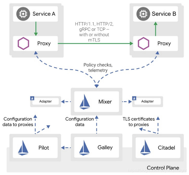 上图是Istio的架构,逻辑上分为数据平面和控制平面。数据平面由一组以 sidecar 方式部署的智能代理组成,负责截获应用网络流量,收集遥测数据并且执行服务治理策略。控制平面中,Galley负责配置管理,Pilot负责下发配置,Mixer负责策略检查和遥测数据聚合,Citadel负责通信中安全证书管理。