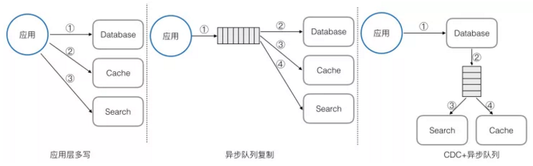 - CDC(Change Data Capture)技术:这种架构下数据写入主存储后会由主存储再向辅存储进行同步,对应用层是最友好的,只需要与主存储打交道。主存储到辅存储的数据同步,则可以再利用异步队列复制技术来做。不过这种方案对主存储的能力有很高的要求,必须要求主存储能支持CDC技术。一个典型的例子就是MySQL+Elasticsearch的组合架构,Elasticsearch的数据通过MySQL的binlog来同步,binlog就是MySQL的CDC技术。