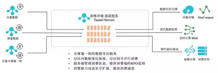 通道服务是Tablestore的CDC技术,是支撑数据派生体系的核心功能,具体能力可参考这篇文章。能够被利用在异构存储间的数据同步、事件驱动编程、表增量数据实时订阅以及流计算场景。目前在云上Tablestore与Blink能无缝对接,也是唯一一个能直接作为Blink的stream source的结构化大数据存储。
