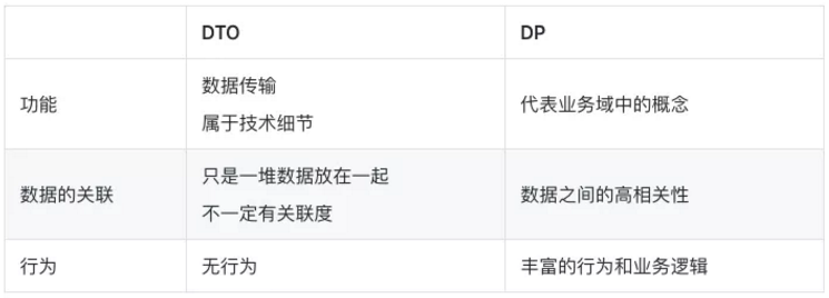 在日常开发中经常会碰到的另一个数据结构是 DTO ,比如方法的入参和出参。DP 和 DTO 的区别如下: