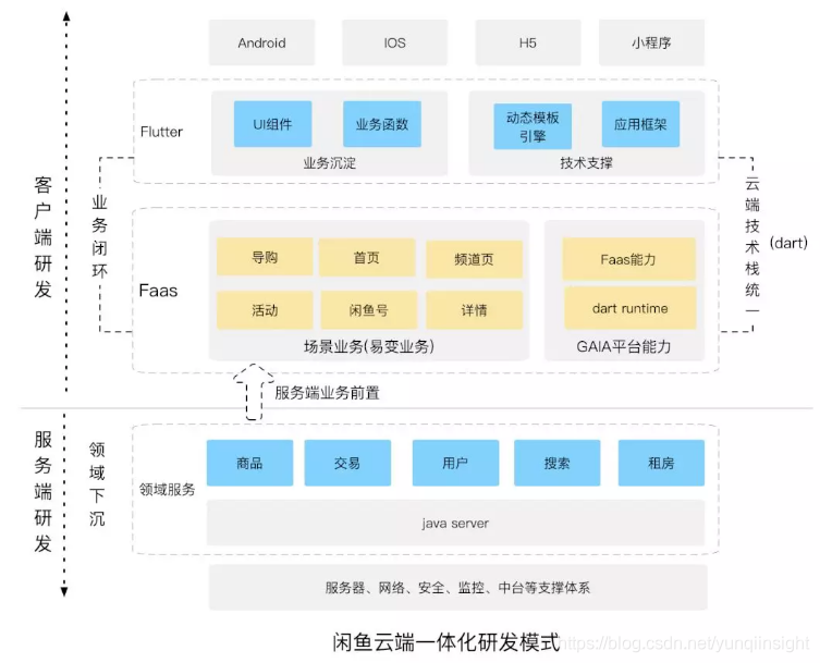 阿里妹导读:当前移动互联网业务研发运维模式,云与多端互相割裂,有些全栈的探索缺乏成功案例,行业对云端一体化研发这块仍是空白,我们要思考:如何能实现 1 个研发支撑云 + android + iOS 三端的业务快速落地?是否有新的研发运维模式,让程序员回归程序?“一次编码、到处运行”是我们的答案。我们在闲鱼项目验证,原本 60 天的项目时间减少了 20 天,提效 33% 。希望阿里高级技术专家孙棋的分析能够给大家带来收获。