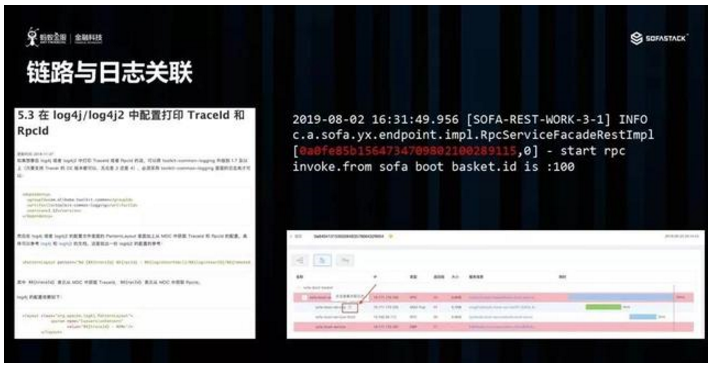 为此,我们提供了一个 SDK,用户可以根据我们官网上的配置,对 log4j 及其他 logger进行配置后,将 TraceId 及 RPCId 从 Tracer 中进行获取,那么在打印的日志的时候,TraceId , RPCId 也会如图上所示,在日志中打印出来。最后,然后通过Trace view,就能在查看链路的同时查看关联的日志。
