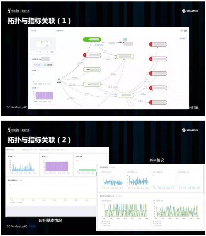 除了链路与日志关联,我们 SOFA 还提供了应用指标的上传功能 在应用上传 Trace 的同时,我们将指标与调用拓扑进行了关联,用户可以点击应用拓扑中的应用,下转查看响应的拓扑指标。
