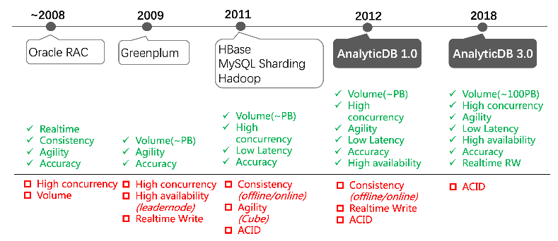 阿里巴巴最初通过单节点Oracle进行准实时分析, 后来转到Oracle RAC。随着业务的飞速发展, 集中式的Shared Storage架构需要快速转向分布式,迁移到了Greenplum,但不到一年时间便遇到扩展性和并发的严重瓶颈。为了迎接更大数据集、更高并发、更高可用、更实时的数据应用发展趋势,从2011年开始,在线分析这个技术领域,阿里实时数据库坚定的走上了自研之路。大规模、海量数据实时分析型数据库系统——AnalyticDB,也是在这个时候诞生。