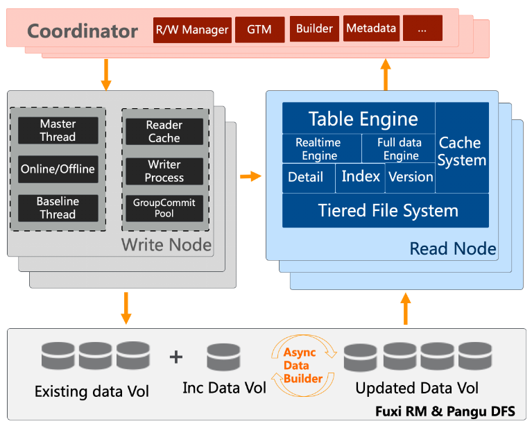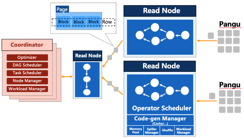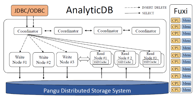 - Pangu(盘古):高可靠分布式存储系统,是AnalyticDB依赖的基础模块。写节点会将写请求的数据刷到盘古上进行持久化。