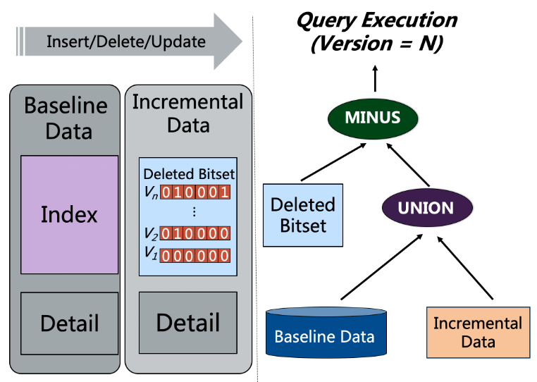 AnalyticDB不仅支持实时INSERT,同时还支持UPDATE和DELETE。执行DELTE时,AnalyticDB没有采用立即物理删除,而是使用bitset来标记被删除的数据行,这些被标记删除的数据会在数据合并(4.1.2)时被真正物理删除。执行UPDATE时,UPDATE操作会被转换为DELETE + INSERT。COPY-ON-WRITE技术被用来支持MVCC多版本控制。当数据发生删除或更新时,AnalyticDB会产生一个新版本的bitset,并将被删除后更新的行的位设置1。此时正在运行的查询可以继续使用老版本的delete bitset,不会被写入阻塞。