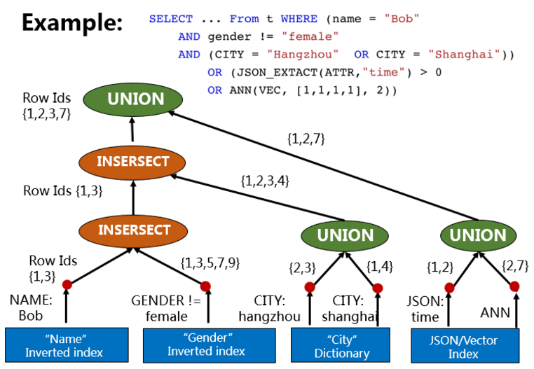 AnalyticDB默认对所有列构建索引,并保存在一个单独的文件中。与传统的数据库不同,AnalyticDB索引中的key是列的值,value是该值出现的所有行号集合,并支持所有的条件同时走索引查询。如图10所示,该SQL是一个复杂查询包括结构化列条件和非结构化列条件。索引引擎会首先对每个条件走索引扫描,得到多个行号集合,然后将AND/OR 条件转换为行号集合的UNION/INTESECT操作。
