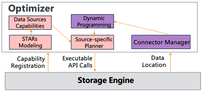 AnalyticDB引入了一种STARs模型作为执行下推的框架,通过将异构数据源的执行能力按照关系代数的维度进行抽象,将存储的能力特征化为其所能处理的关系代数的能力。在优化器完成初步的分布式执行计划后,利用动态规划的方式针对不同的数据源将适合下推给存储执行的关系代数算子进行封装,转化为对应的存储的API调用。